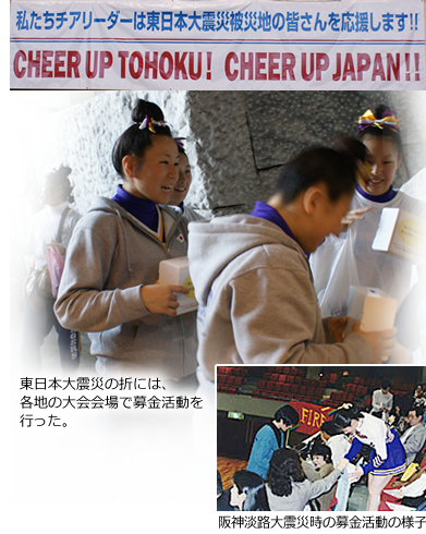 また、第1回大会の開催当初より、国内協力としてはNHK厚生文化事業団へ、海外への協力としては公益財団法人日本ユニセフ協会を通じ、国内外で支援を必要とする方々への募金活動を継続的に行ってきました。 チアリーディングがもつ応援の力を、競技だけでなく社会貢献へも活かすことで、笑顔とエネルギーあふれる持続可能な地域社会の実現に寄与しています。